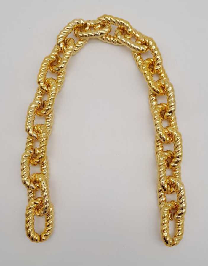 Uzunluk: 45 cm Halka genişliği: 2,5 cm Zincir halkaları eklenmek suretiyle yapılmıştır. Uçlarına kanca veya yaylı halka ile veya doğrudan örgüye dikilerek kullanıma uygundur.