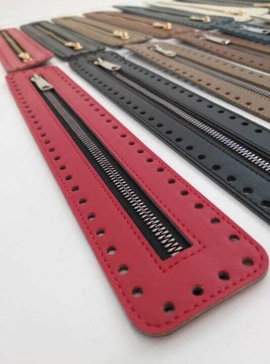 Suni deri kullanılmıştır. Ebatları 30X5.5 cm'dir. Renk ve Metal seçenekleri ayrı ayrı yüklenmiştir. Kenarlarındaki delikler tığ ile monte etmek için tasarlanmıştır. Dikerek de montaj yapılabilir. Örgünün kendi ipi ile montajı yapılabilir. Tek olarak gönderilir.