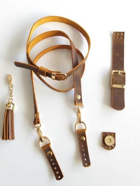 Angel Çanta Aksesuar Gerçek Deri Cepli Ayarlanabilir Çift Saplı Çanta Seti Taba Renk Light Gold Metalli