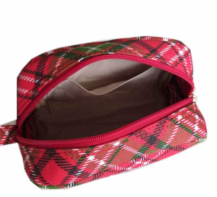 Tabanı 17x7.5 cm Yükseklik 11 cm. Ağız kısmı fermuarlıdır. İçinde cep vardır. İçine tığ, makas gibi elişi malzemelerinin konulması için uygundur.