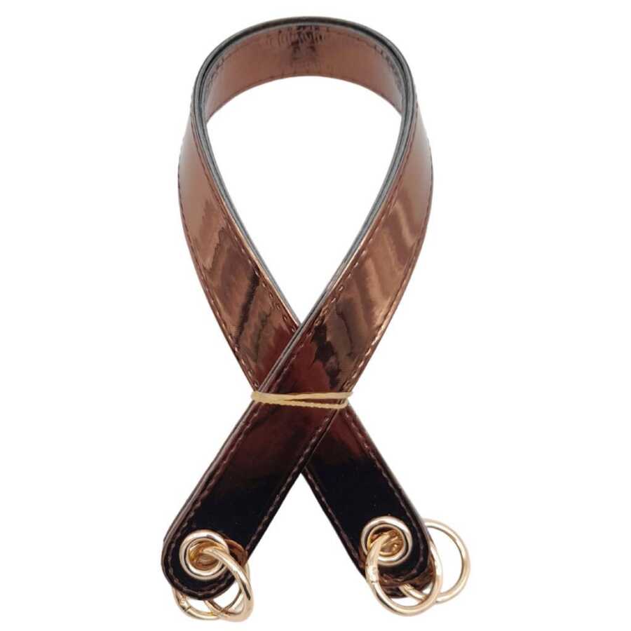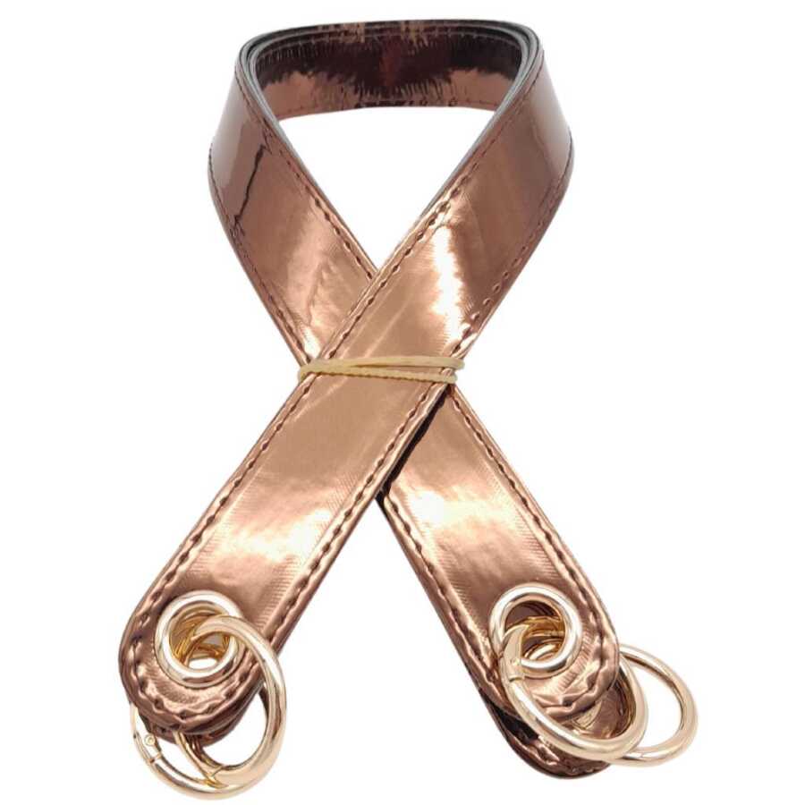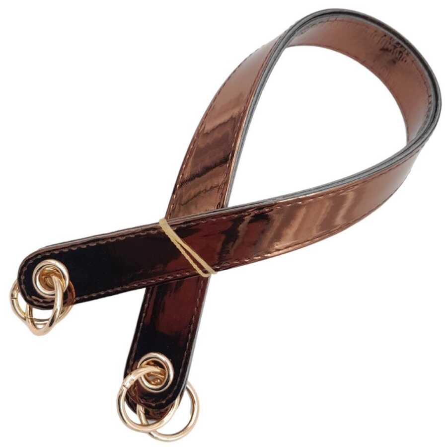 Parlak Rugan Deri Kuş Gözlü Çift Çanta Sapı Özellikleri: Yaylı Halkalar Dahil Uzunluk: 62 cm Deri Kısım Uzunluk: 58 cm Genişlik: 3 cm Deri: Parlak Rugan Deri Metal Renk: Light Gold Çift olarak satılmaktadır.