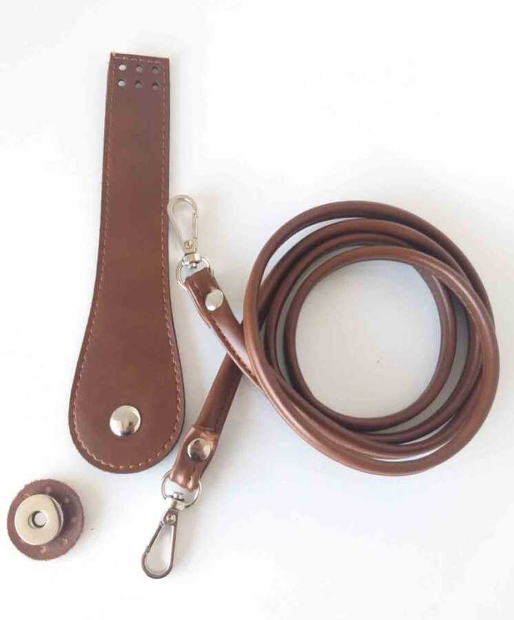 Suni deriden üretilmiştir. Suni deri spagetti sap yaklaşık 120 cmdir. Örgü çantaya kancalardan monte edebilirsiniz. Kapak mıknatıslıdır. kapağın iki parçası da örgü çantaya monte edilebilecek şekilde yapılmıştır.