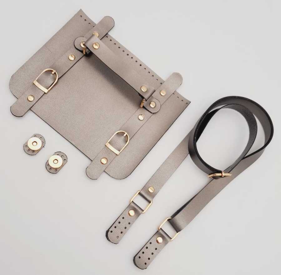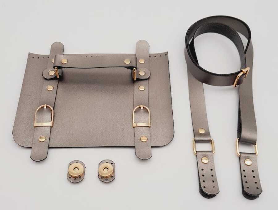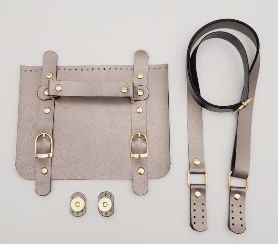 Angel Çanta Aksesuar Suni Deri Çift Tokalı Ayarlı Saplı Parlak Gri Renk Çanta Deri Seti Light Gold Metalli