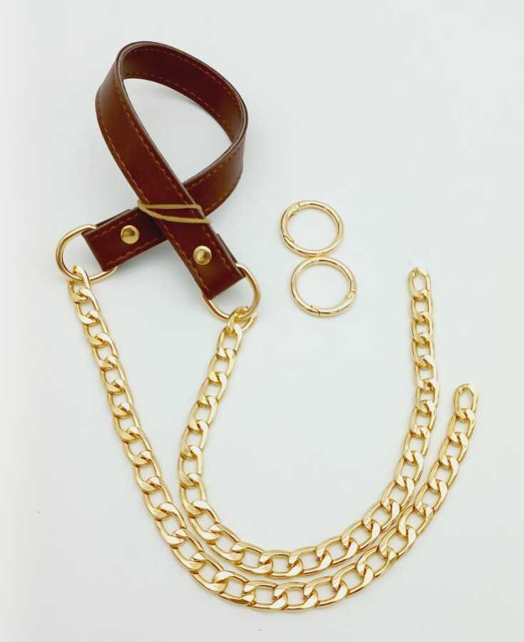 Angel Çanta Aksesuar Suni Deri Dikişli Taba Renk Light Gold Zincirli Çanta Sapı