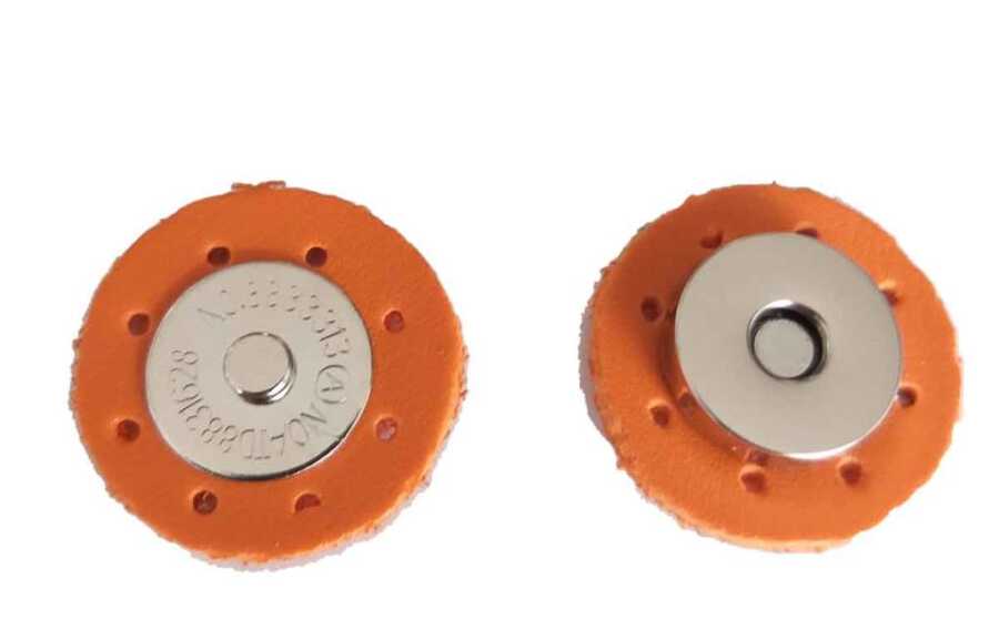 Suni derili mıknatısın Suni deri kısımla birlikte çapı 3 cmdir Örgüye monte edilebilmesi için kenarlarında delikleri açılmıştır